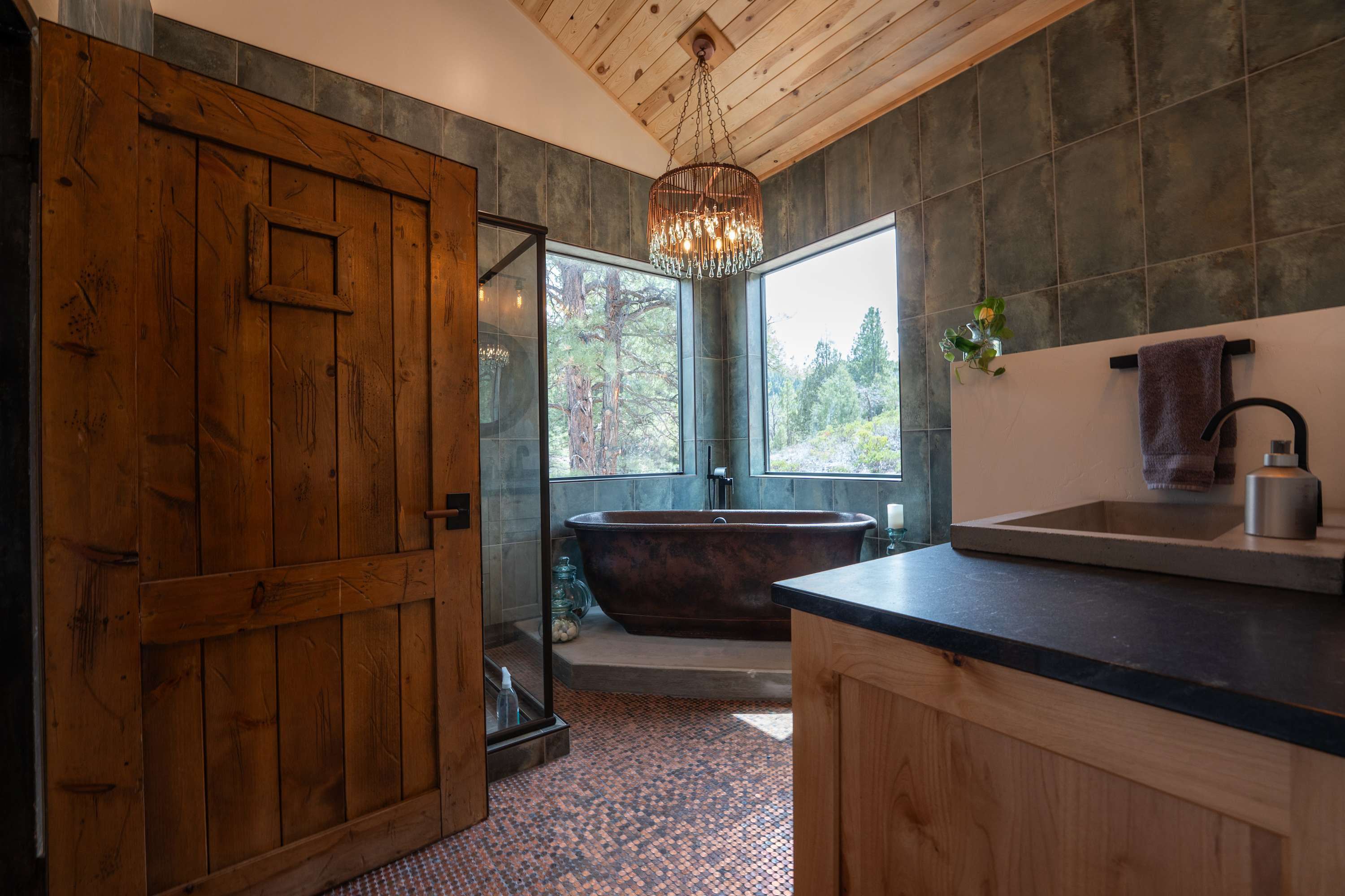 Indulge in a leisurely soak as you sink into our master suite's oversized copper tub, where the rich patina and natural warmth of the hammered copper create an atmosphere of pure luxury. Then step onto our unique penny floor and experience the unexpected warmth and tactile beauty of 10,000 individually set copper coins underfoot.