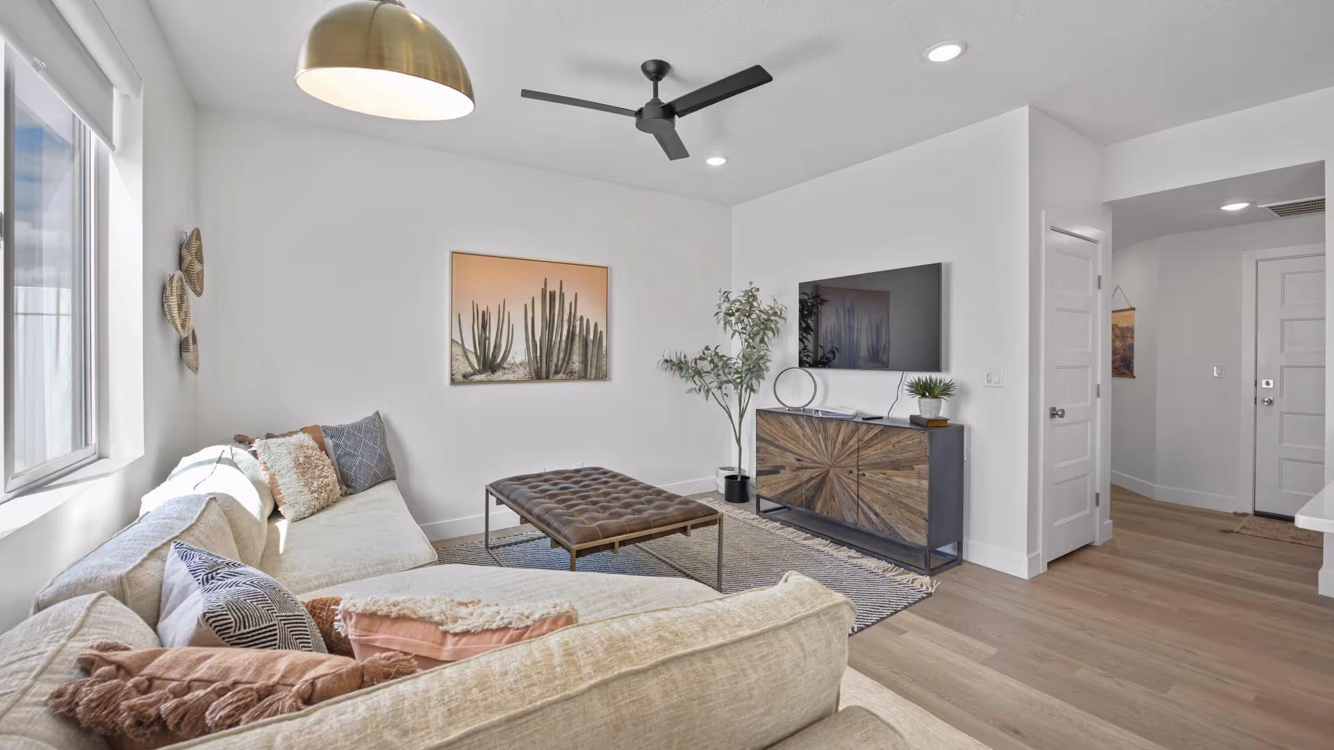 Living Area - Open floor plan, comfy sofa, coffee table, end table, large Smart TV connected to our high-speed internet.