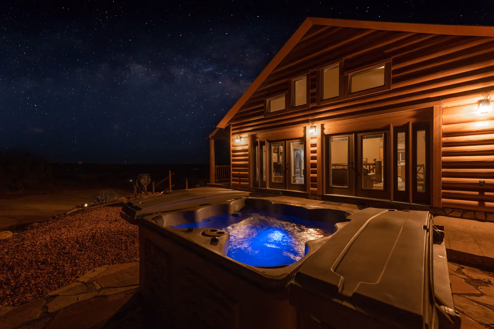 Outside: Wraparound covered porch, outdoor seating, hot tub, play area with swings, climbing wall & two slides, BBQ grill, firepit with seating, amazing desert views.