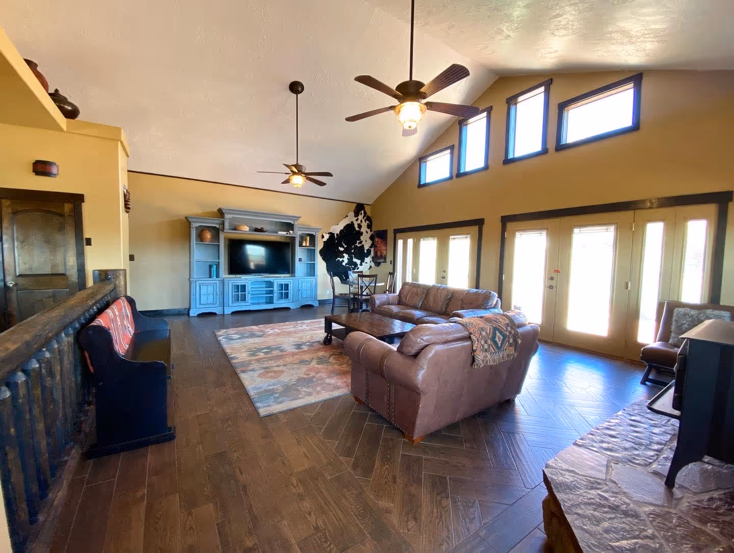 Living Room: Vaulted ceiling, large windows, Smart TV, two large leather sofas, two chairs, bench, wood burning fireplace, ceiling fans, access to patio and hot tub, dining table with seating for up to six.