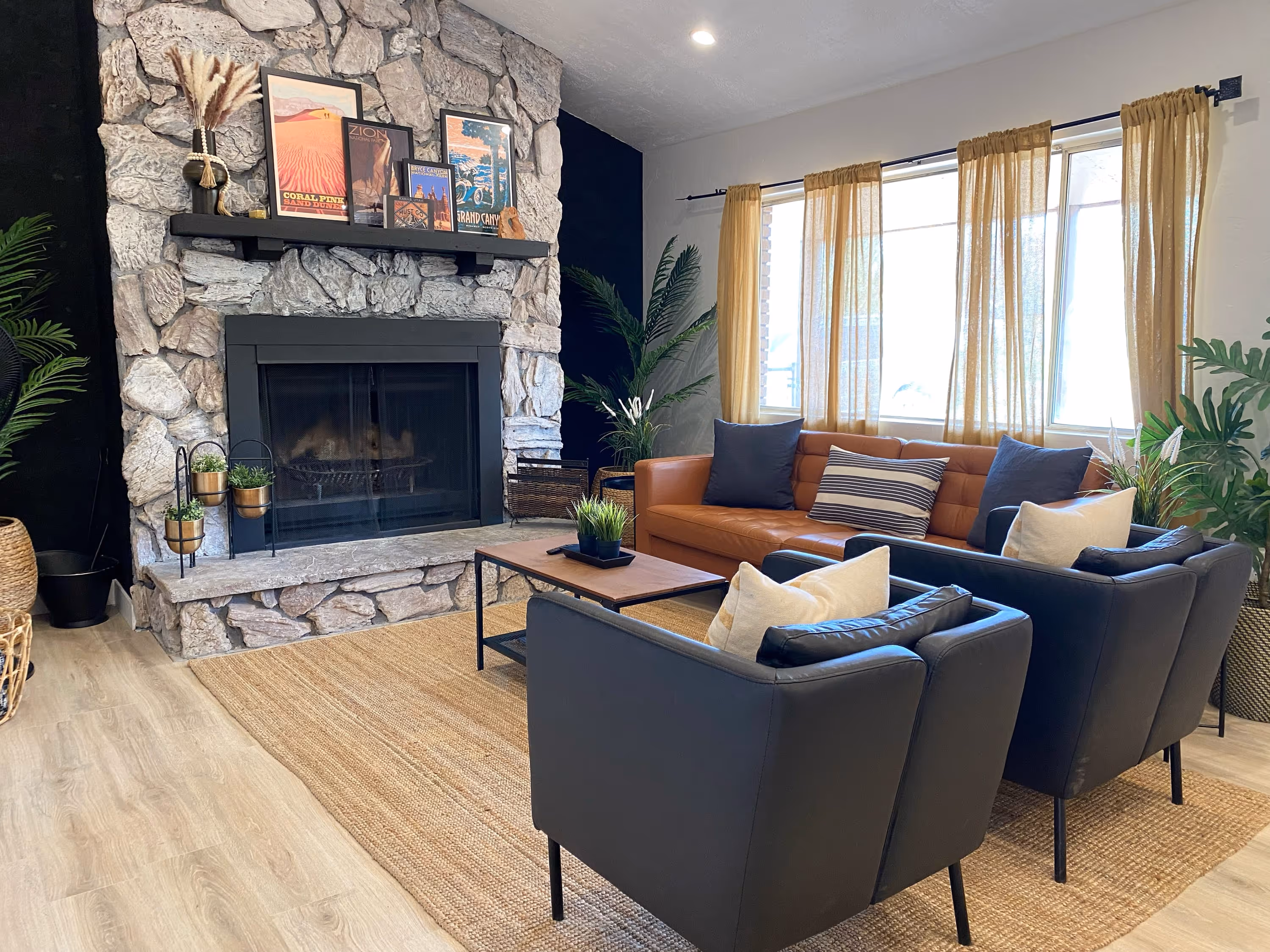 Living Room - Stylish southwest decor, couch, chairs, fireplace, TV.
