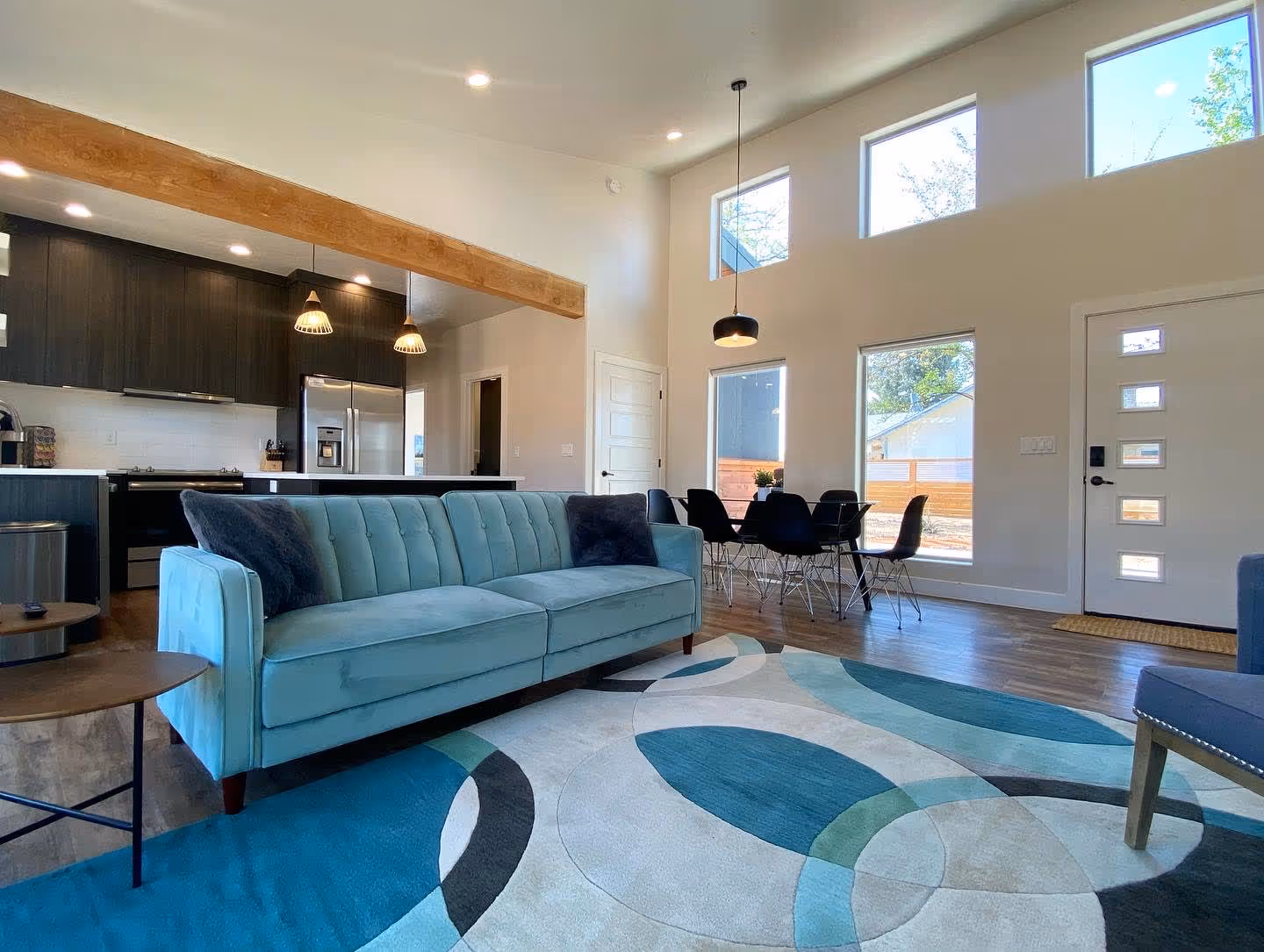 With its high ceilings, the light and airy living room offers an open floor plan to maximize the space. In addition to the sofa bed, you'll find additional seating to watch your favorite shows on the large flat-screen TV. We provide Hulu, Disney+, ESPN+, Freevee and Roku TV.