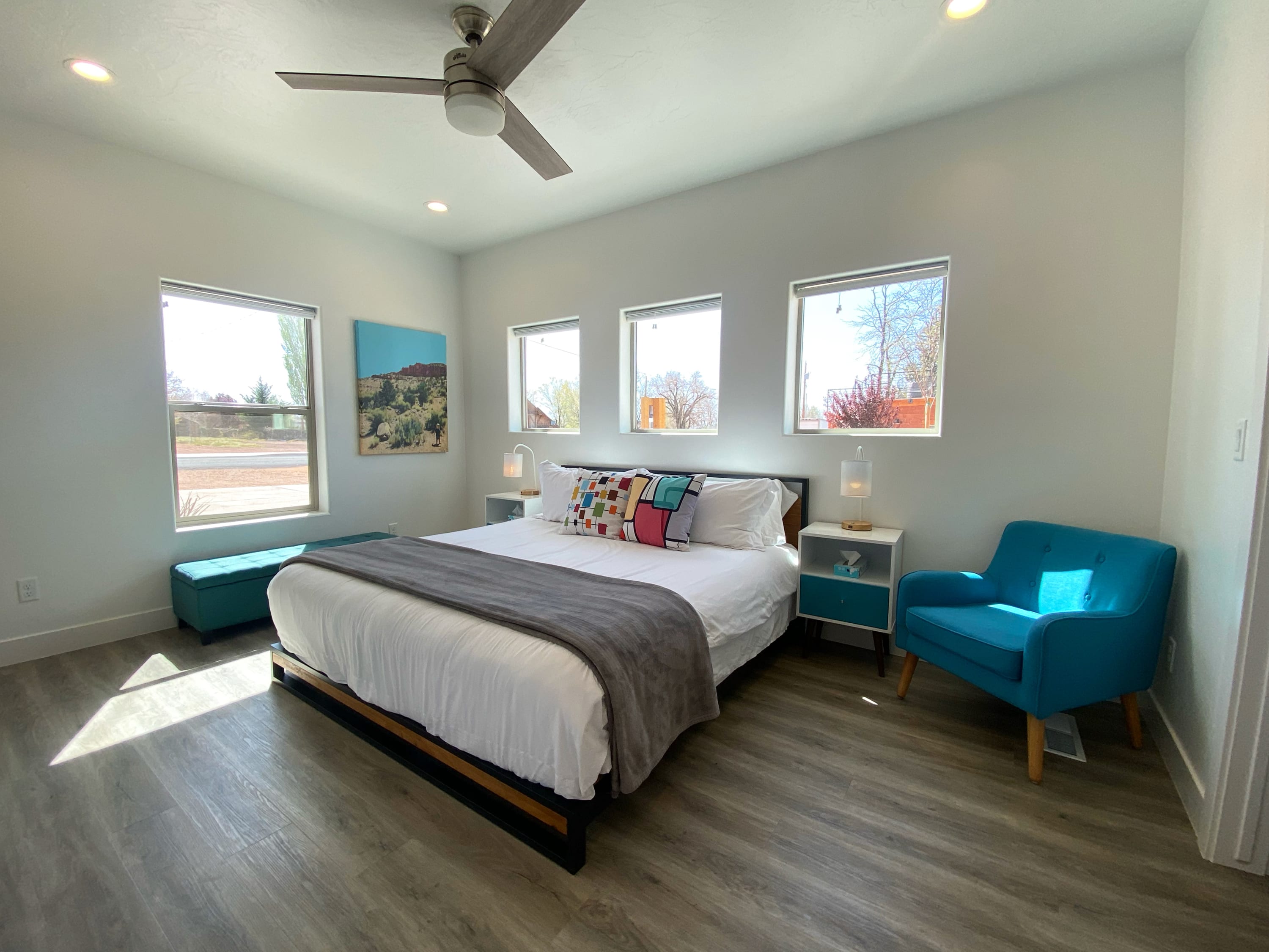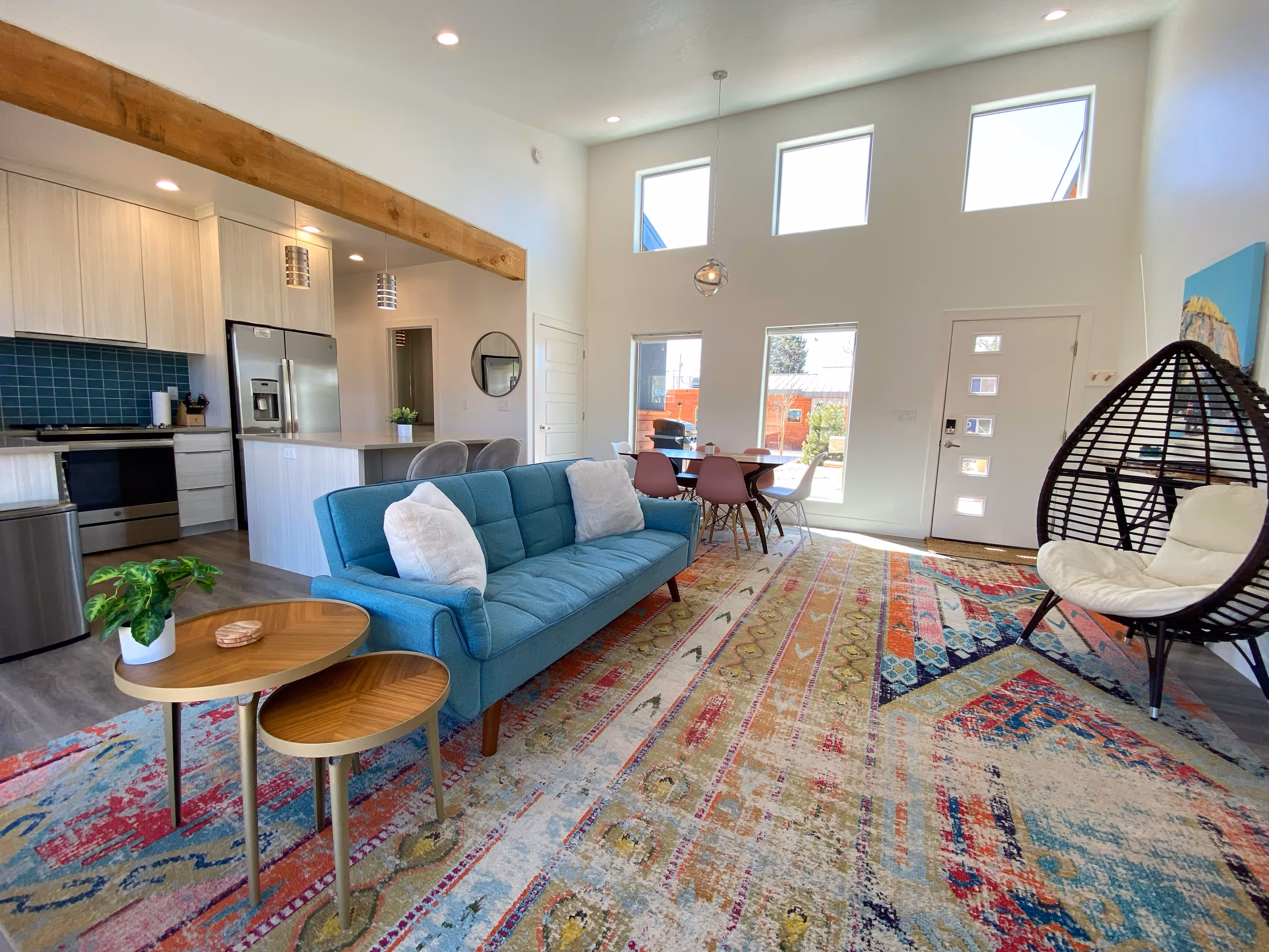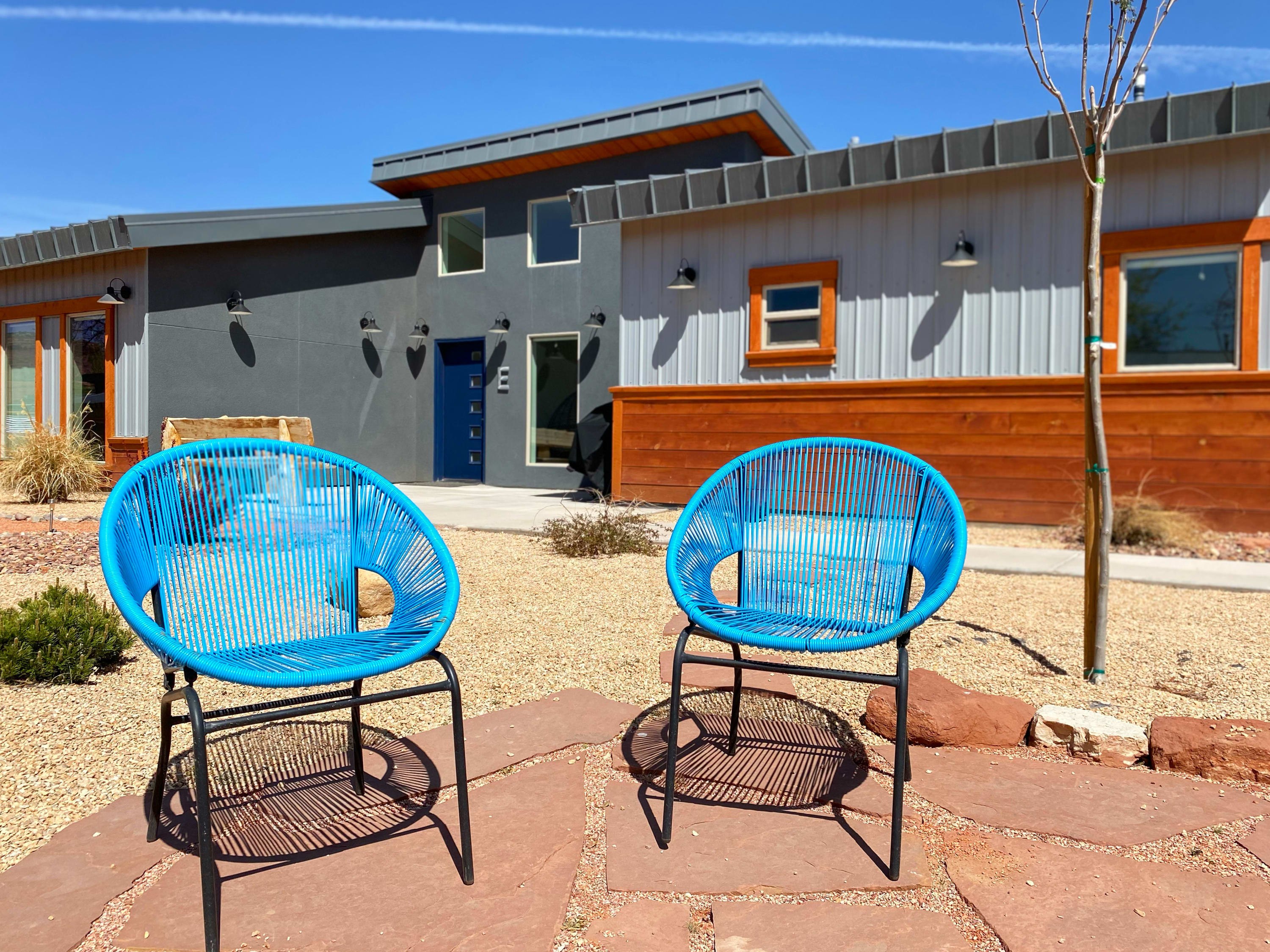 Adventure seekers, look no further! Timber + Tin E equips you to explore southern Utah with all the essentials for a memorable stay. Accommodate your group perfectly with two king beds and a sofa bed, sleeping up to six. Two full bathrooms provide privacy and convenience.Open and bright, the living room boasts dramatic ceilings that flood the space with sunshine. In addition to the sofa that also doubles as a bed, there are comfy chairs to ensure that movie nights are fun and cozy. We provide Hulu, Disney+, ESPN+, Freevee and Roku TV.Prepare gourmet meals in the modern kitchen, equipped with top-of-the-line appliances and all the essentials. Gather family and friends around the dining table or kitchen island to recount the day's adventures.Outside, you will have your very own barbecue grill, a rooftop deck with table & chairs, and a fire pit (perfect for roasting marshmallows!). As well, you'll have access to all of the common areas, which include a pavilion in the recreation area, games (corn hole!), pool, hot tub, and the restored 1920's barn. Make some new friends and while watching one of the many terrific old Westerns filmed in Kanab, and then play some games in the barn loft.